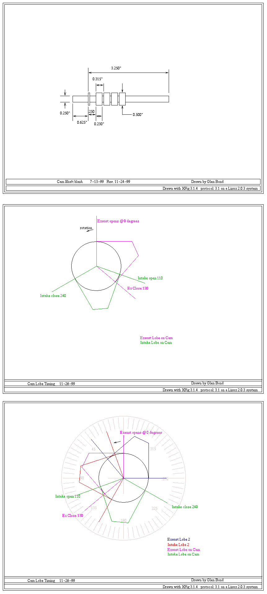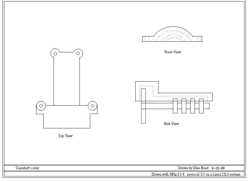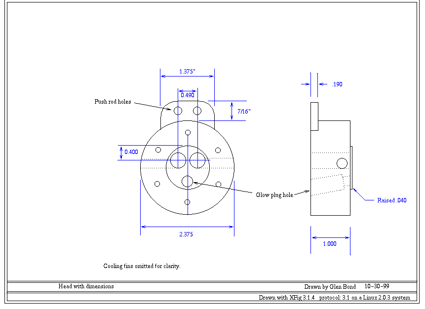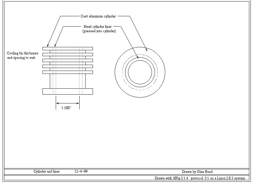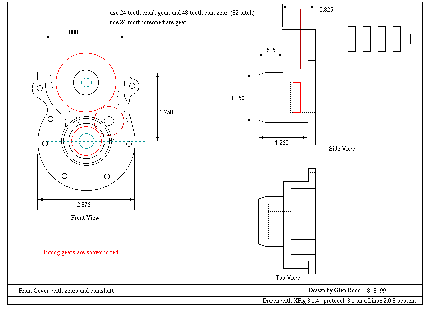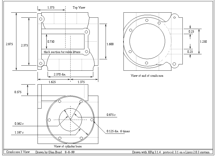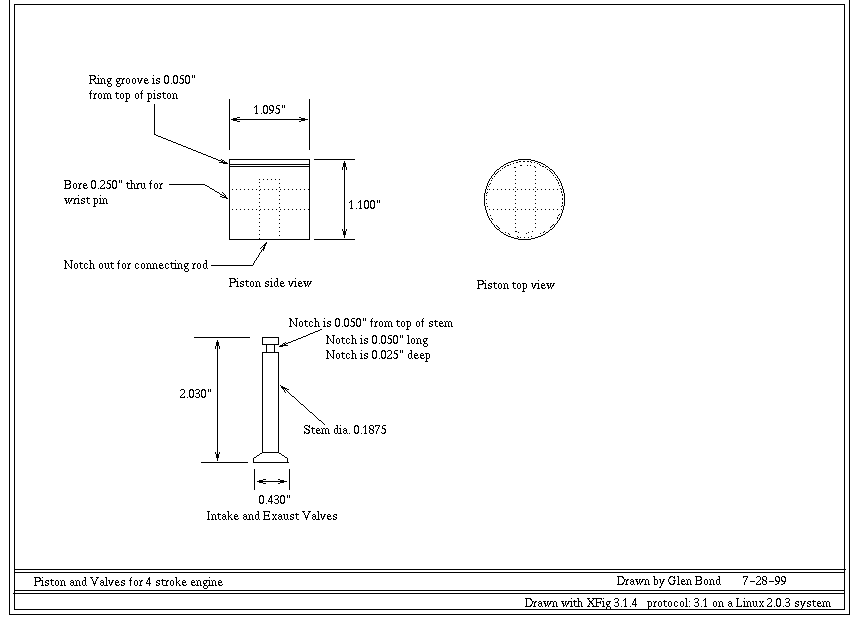The plans were drawn on a Linux system using Xfig. I have the plans available in FIG format or in GIF format. Each plan is formatted to print on a single sheet of 8.5 x 11 paper. The FIG format should print out full size, I am not sure about the GIF format. Please be aware that these plans are not complete and were drawn for my use. They assume a good knowledge of how the engine is built and designed. Feel free to use them and if you have any questions send me Email |