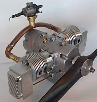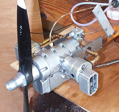 16-Aug-03 Wooo Hooo...!! I got a good run today. The engine does run. I assembled it, added an oil pressure tap so I could keep an eye on the pressure, filled it with 100 ml. of 10W40 motor oil and cranked it up. I had a shorted glow plug that gave me some problems, but soon got that sorted out. I was not able to get the carb. adjusted for an optimum run, but I was able to get it up to a little over 7000 RPM with a 18x6 Master Air Screw prop. I was checking the RCM Engine reviews and found that a Saito FA-200Ti, 2 cyl. 2 Cu. In. engine will turn an 18x6 prop at 7700 RPM. I think that I can match that, maybe better if I can get the carb adjusted. The oil pressure at max is about 65 psi. When warmed up and at idle it is 20 psi. I am using glow fuel now to work out all of the problems before I convert to gasoline. I am not sure what kind of problems I will encounter when trying to make a glow carb. work with gasoline. Everything is looking real good at this point. The new cam looks like it will be OK. |