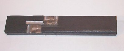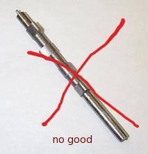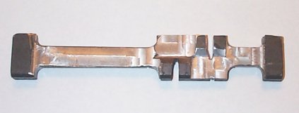 27-Oct-2008 Well it has been quite a while since the last update, but I do have some new information. I have had correspondence with Darin Morgan (full size engines), who has given me much information on cylinder head design, much of which I may incorporate into my engine. I have also had correspondence with David Bowes, who has been a great source of information on miniature engines. When I told Dave that I had blow-back through the carb at high speeds, he suggested that I install stronger springs on the valves, which I did. This stopped the blow-back. Then in my quest for more speed and power, the connecting rod for cylinder #2 (from the front) broke. The engine suddenly locked while running at a high speed. I was afraid of what I might see when I opened the crankcase, but the only damage was a broken rod. The crankshaft was slightly twisted, about 1 or 2 degrees, because of the sudden stop. I have no plans to fix the crankshaft. I think that it will be good enough for the purpose of this engine. The rod broke at the place where it was cut for an offset.(shown by the arrow) The old rod had a square cut, and I knew, if I had given it some thought, that it would break at the notch. The new rod has a curve that eliminates the square cut and its high stress point. I still have to find a carb that is a little bit larger than the one that I have. I think that the engine will run faster than ever, but I need a good carb. |