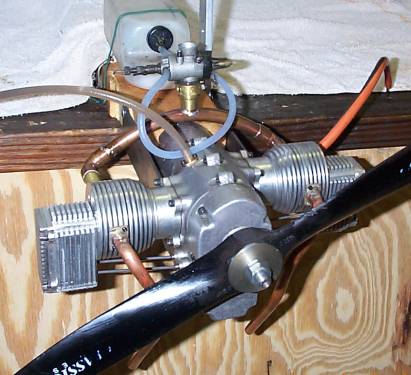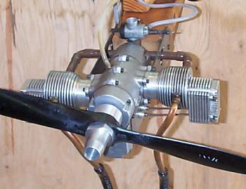 27-Apr-06 Today I was able to run the engine with the new crankshaft. I ran it for a few minutes last week to loosen it up a little. Today I was able to get the speed up to slightly over 8000 RPM!! Still using an 18x6 Master Air Screw prop. This engine is going to be a real power house. I am still having a problem with fuel flow into the engine at high speeds. I am going to try to make a muffler with a pressure tap to pressurize the fuel. Other changes: I drilled out (very slightly) the needle valve hole for more fuel flow. Apparently this has helped. I also made a new intake manifold, this one moves the carb down almost an inch an a half. this will make the engine more adaptable to a plane. The new crank seems to be doing fine. I made a new prop hub, much larger than the old one. I also made a new starter hub so that I can use a normal engine starter. This one screws on to the crank and a lock nut screws on after it. This helps to keep the prop from flying off. Weight dry: 5 lbs, 14 oz. |
